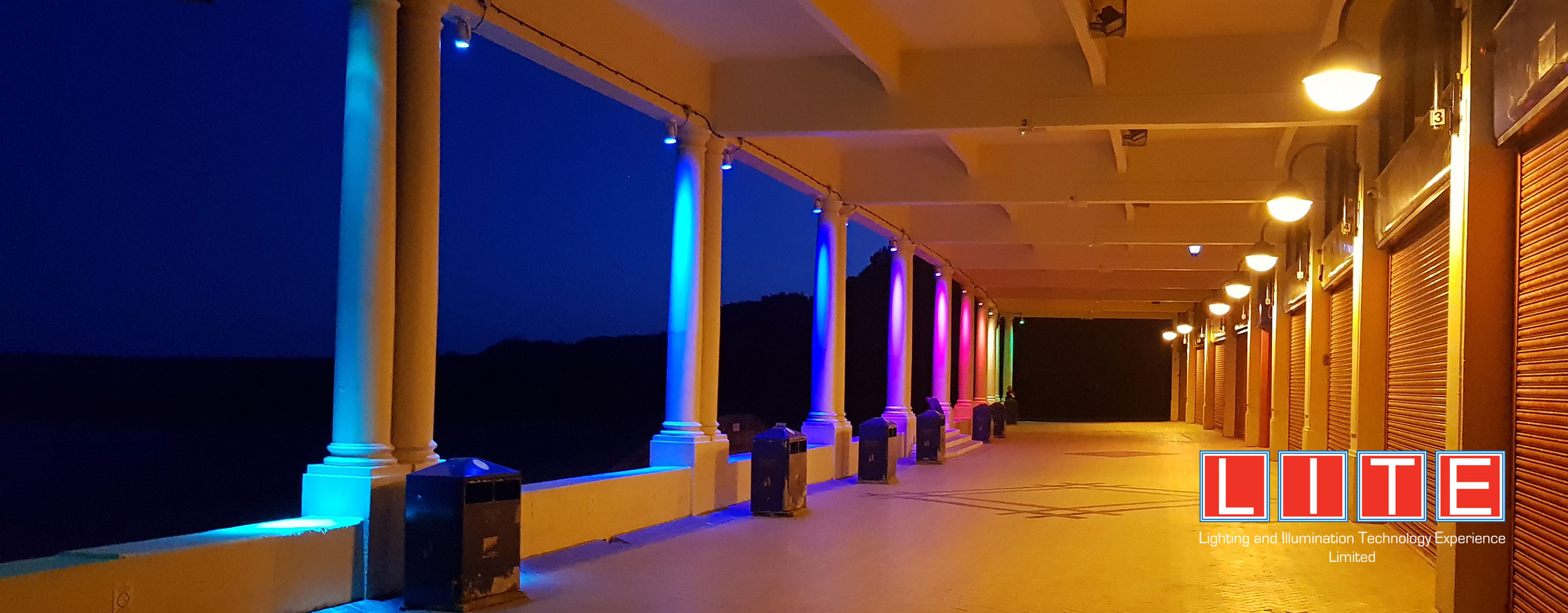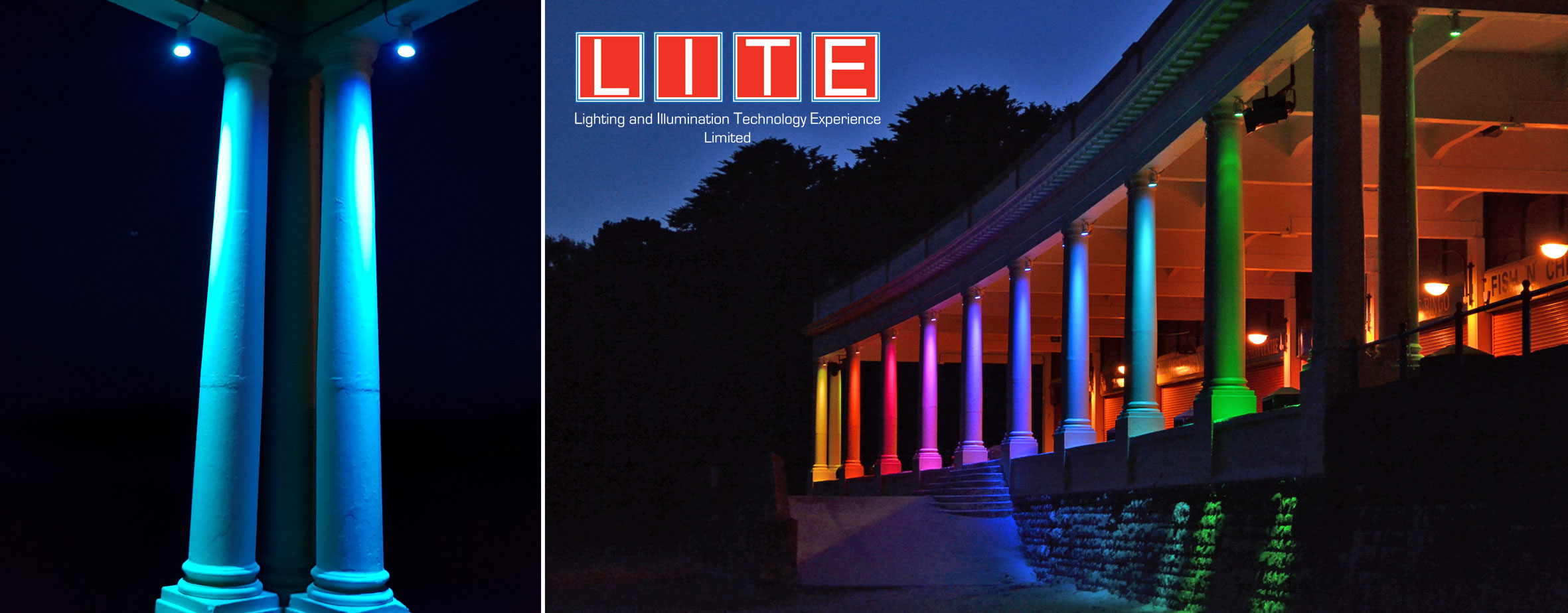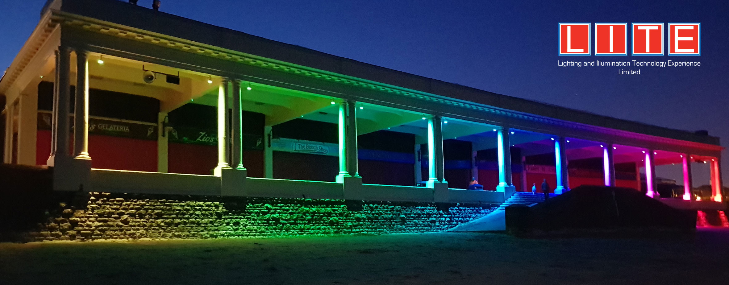 The £45k project has delivered a scheme where the lighting makes a feature of the building’s curved colonnade, and brings it to life each evening with a range of lighting patterns using Color Kinetics ColorBurst Compact RGB luminaires with a special ‘letterbox’ lens. The lighting show uses a spectrum of colour that moves from one end of the shelter to the other, depending on pedestrian movement at either end. It also features a two colour pattern that moves across the 55m façade. The control system is currently being updated to a Pharos controller to allow for 4G remote access.