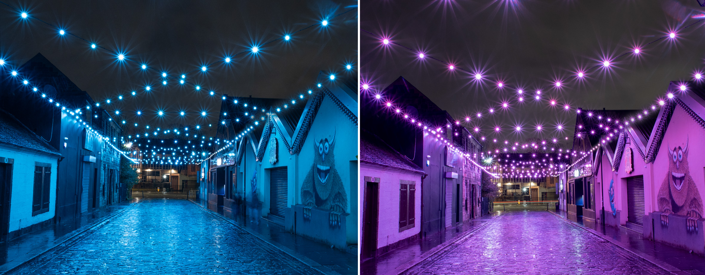 As the buildings along Shuttle Street are of different ages, and heights and have different usages, this presented an installation challenge to the team, particularly as some were lower than the minimum height requirements and others were listed buildings. LITE created custom brackets to resolve this issue, calculating the loads and tension on the wires to protect the building’s infrastructure. They also ensured permission was obtained from the individual building owners to fix the catenary wires to each property. The result is dynamic lighting that can be remotely programmed by the Council to set various lighting programs and colours to celebrate national holidays and awareness days.