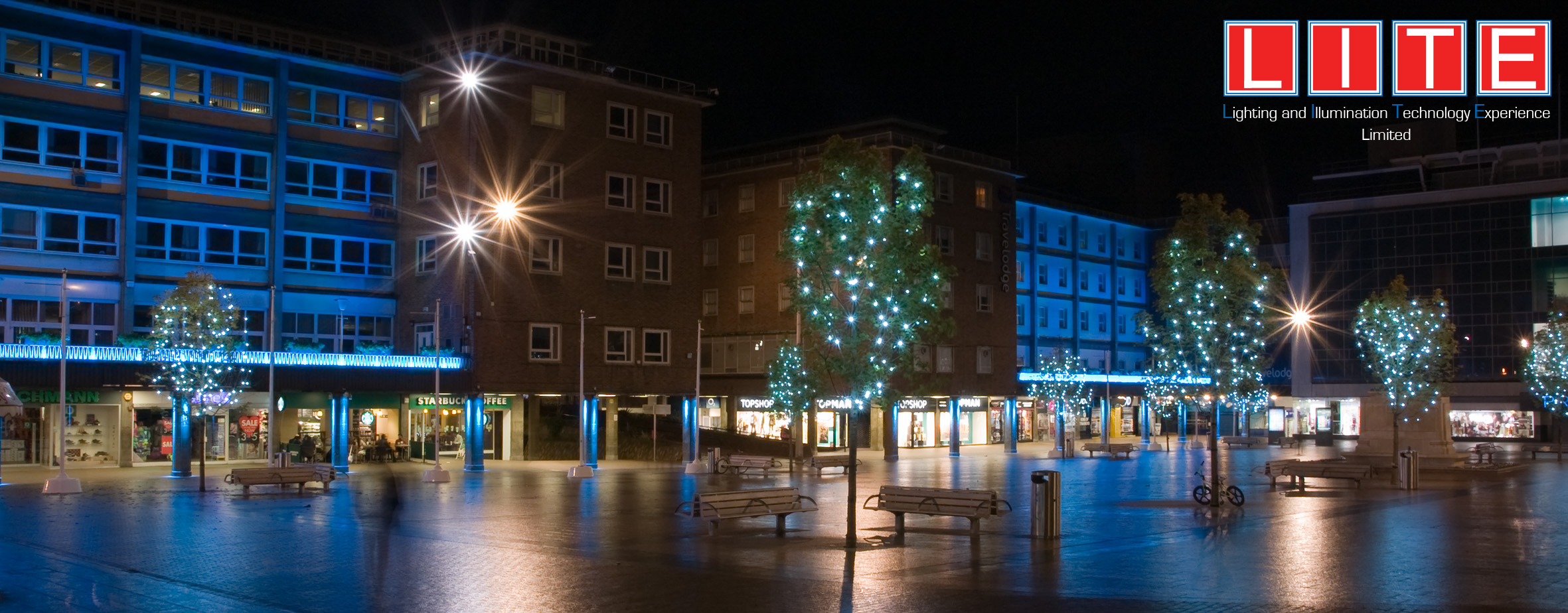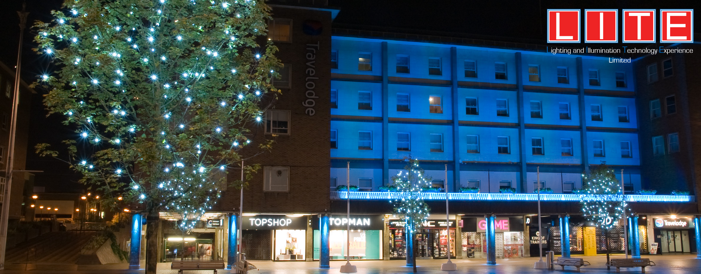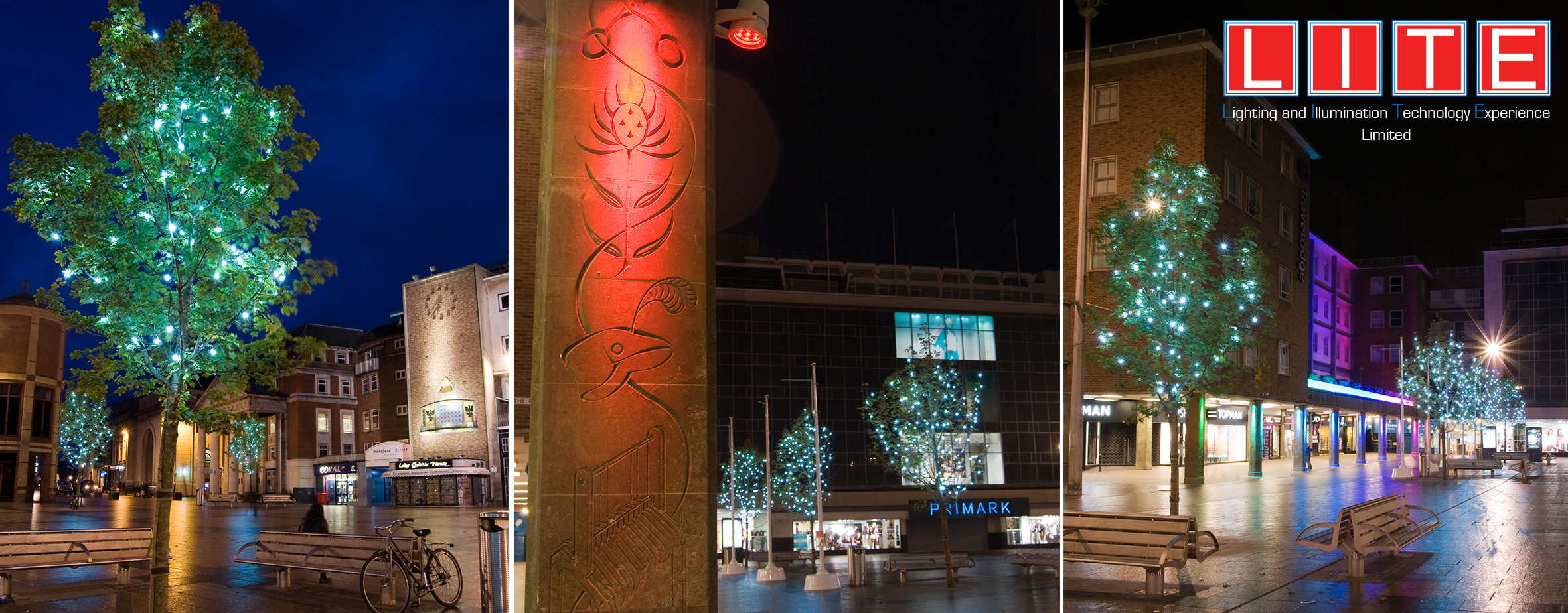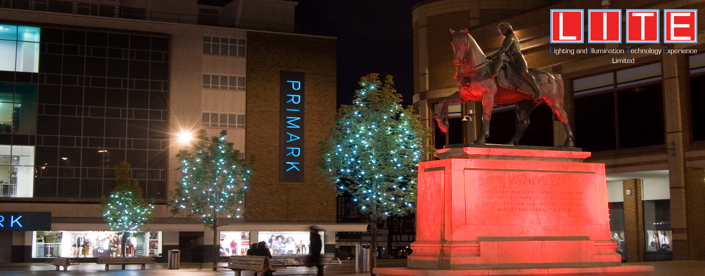 The concept was to develop a lighting solution to enhance the multi-million pound regeneration project within Coventry City Centre. Working closely with the Regeneration Team, the appointed contractors and Philips Lighting we proposed a scheme that framed the buildings along one side of the square using a colour change RGB solution to provide a visual backdrop. This was then supplemented by down washing the building support columns on three sides to provide pools of light on the floor. The Lady Godiva Statue was uplight using recessed RGB floodlights whilst the Godiva Clock was sympathetically lit with a warm white LED solution. The Peeping Tom in the centre of the clock was also spotlighted to enhance this feature when he appears. To further enhance the visual space the new trees were dressed with our MaxiLED small globe series with Cool White LED’s – these are a permanent install and are to provide year round sparkle to the trees and environment throughout the seasons. The lighting runs a number of set shows throughout the year and can be reprogrammed for specific events such as Godiva Week, Christmas – the Client underwent Lighting Controls Training provided by LITE Ltd so they are able to reprogram their own lighting shows now.