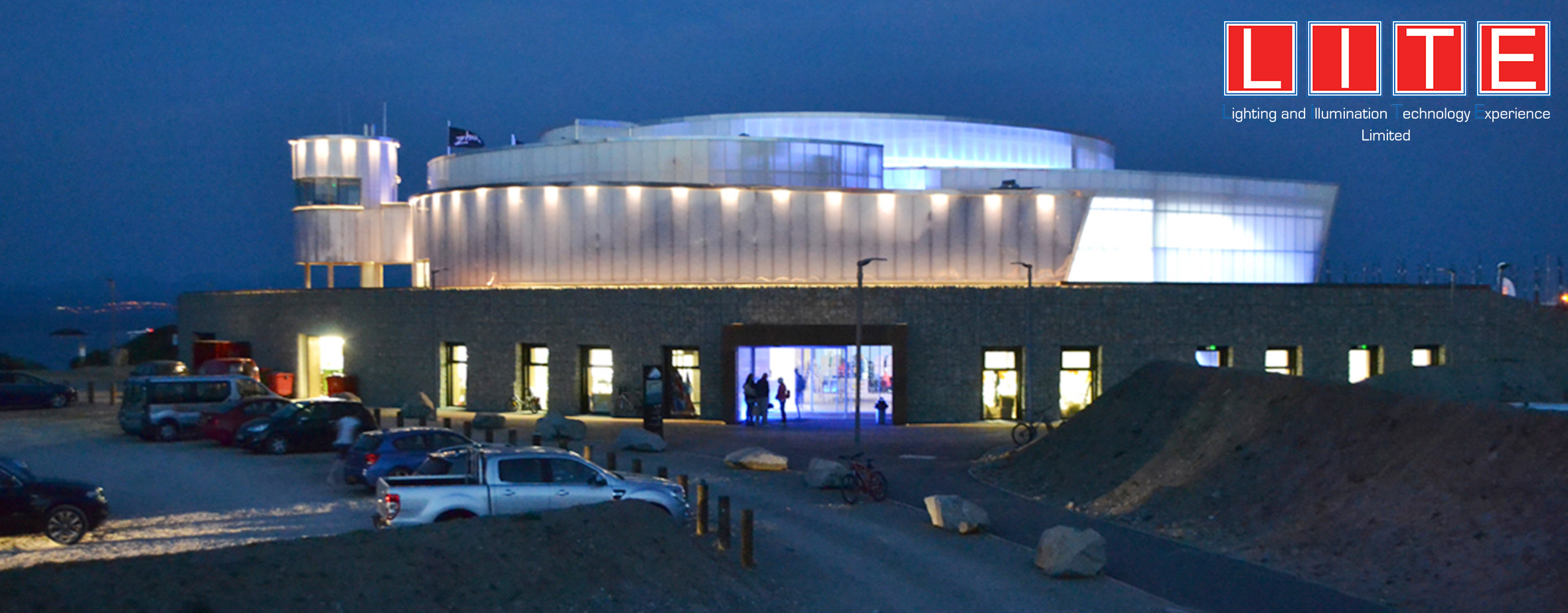 The colours of the lighting, which is both interior and exterior, change according to the actual wind speed whilst a gap in colour moves around the circular building to reflect the wind direction. Inspired by the Beaufort Scale, used by sailors all over the world, the colours move in degrees through the colour range according to the wind speed measured in the roof of the building.