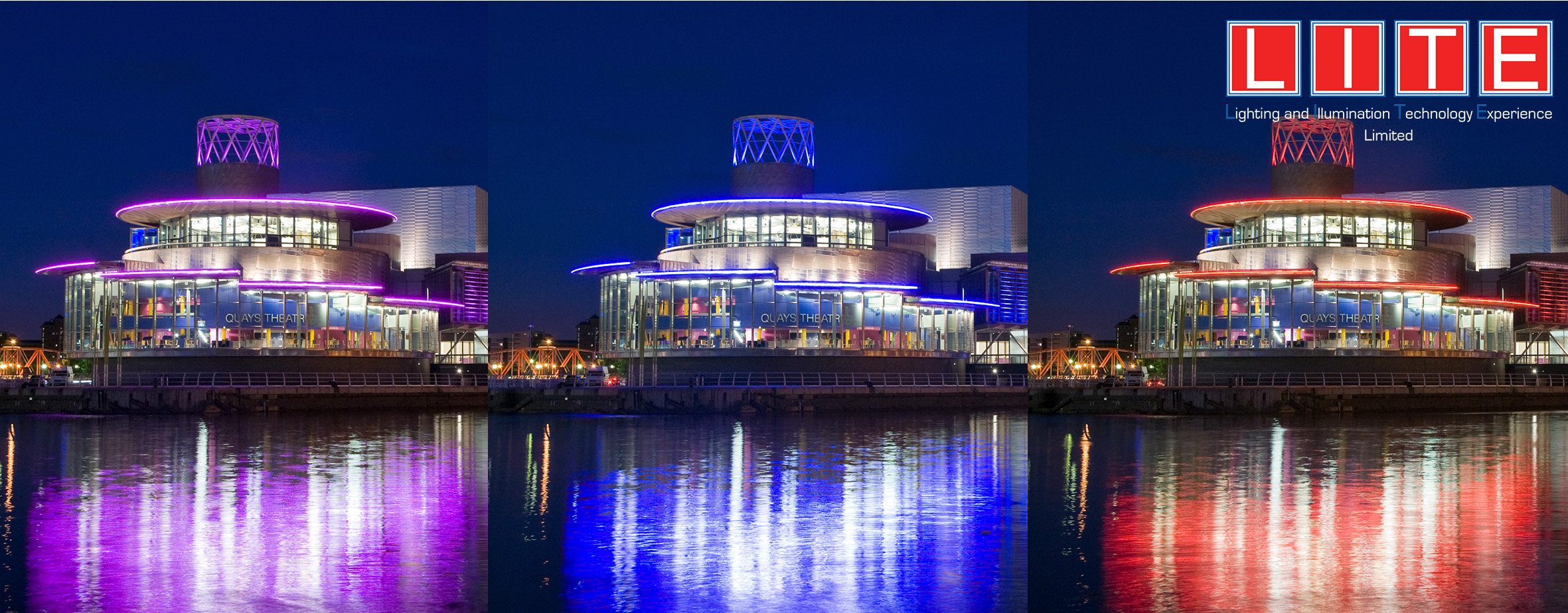 The curved roofing is illuminated using RGB LED Flex LMX with the louvers uplit using ColorBlast.