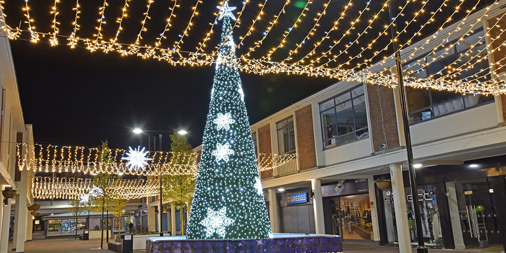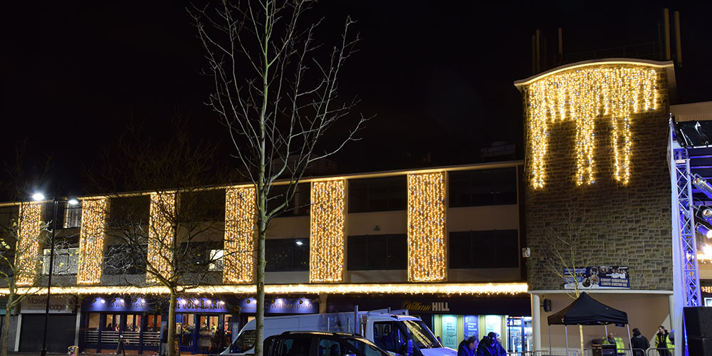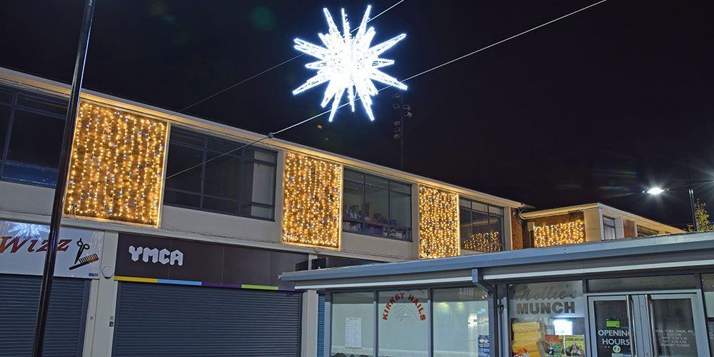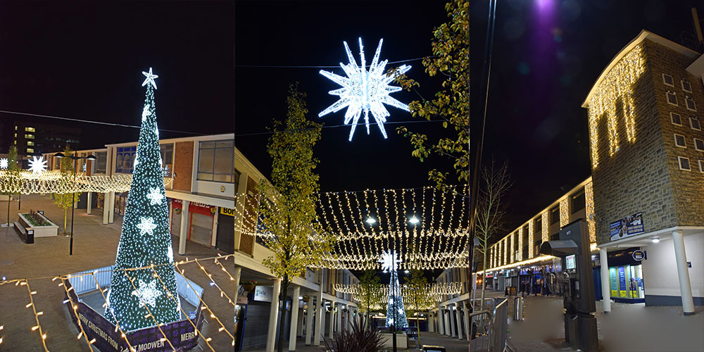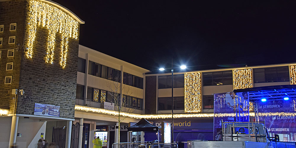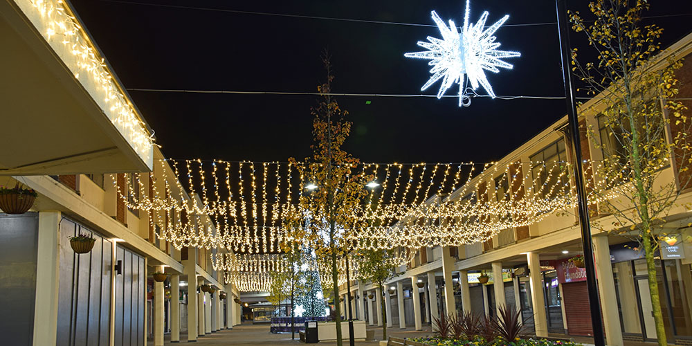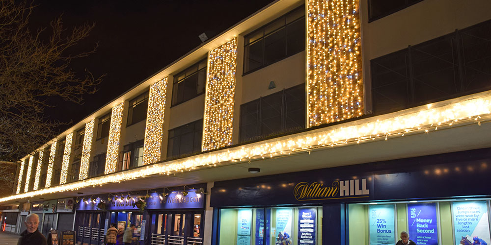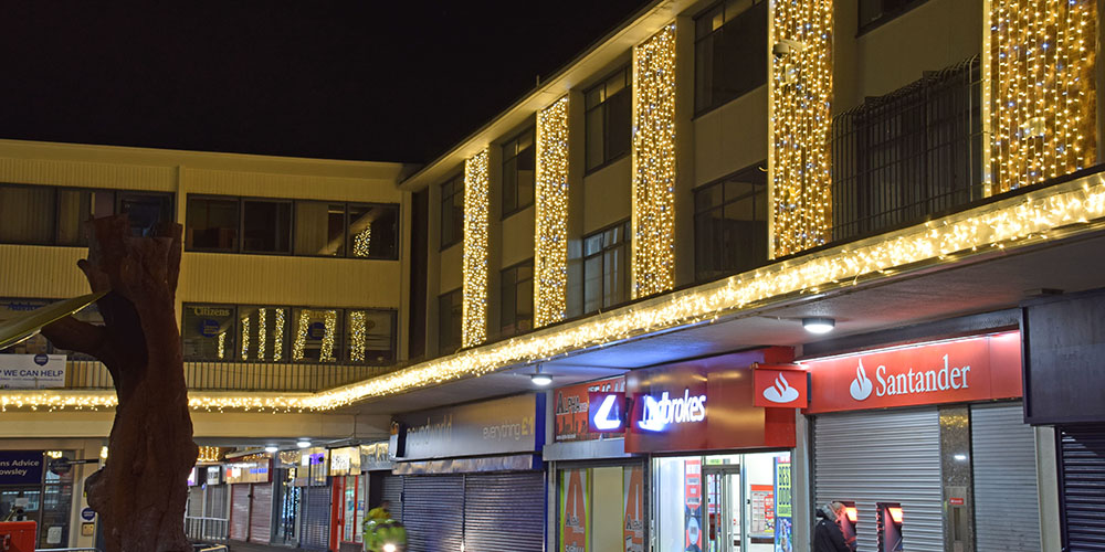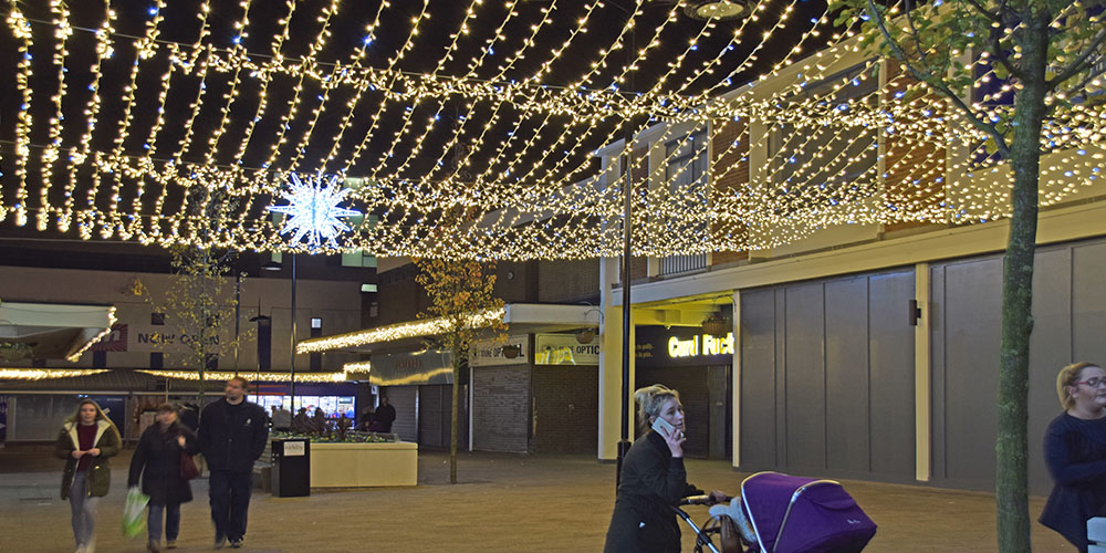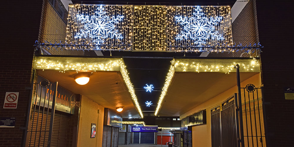 Using a variety of products, we were tasked with bringing Kirkby to life by the St Modwens Group Working very closely with the centre manager we chose an elegant gold and silver design, using our heavy duty rubber cabled MiniLEDs in gold and silver twinkle effect to create large curtains of light cascading down the walls of the buildings, and also to create large ceilings of light along the pedestrian walkways