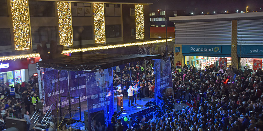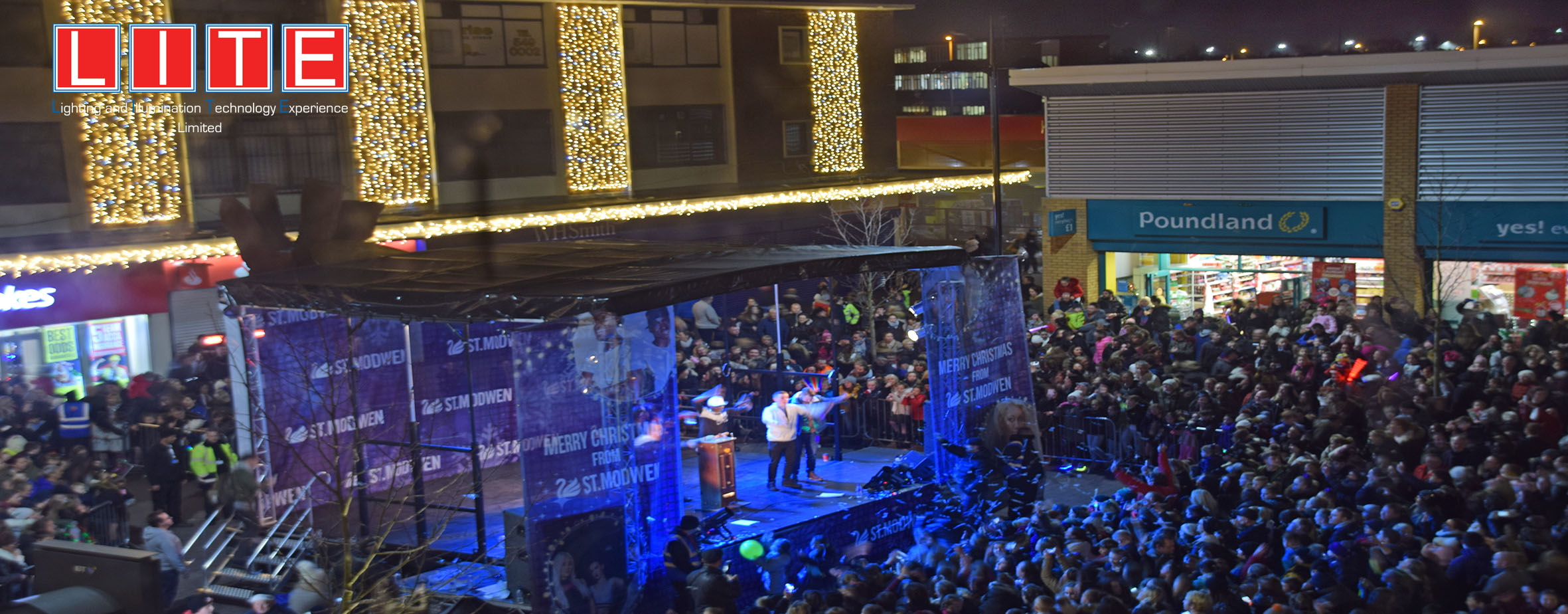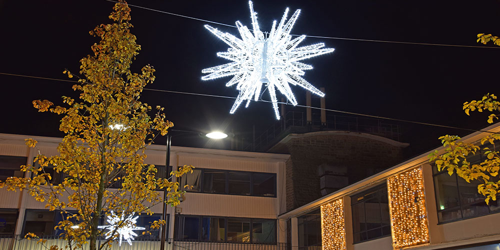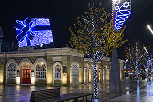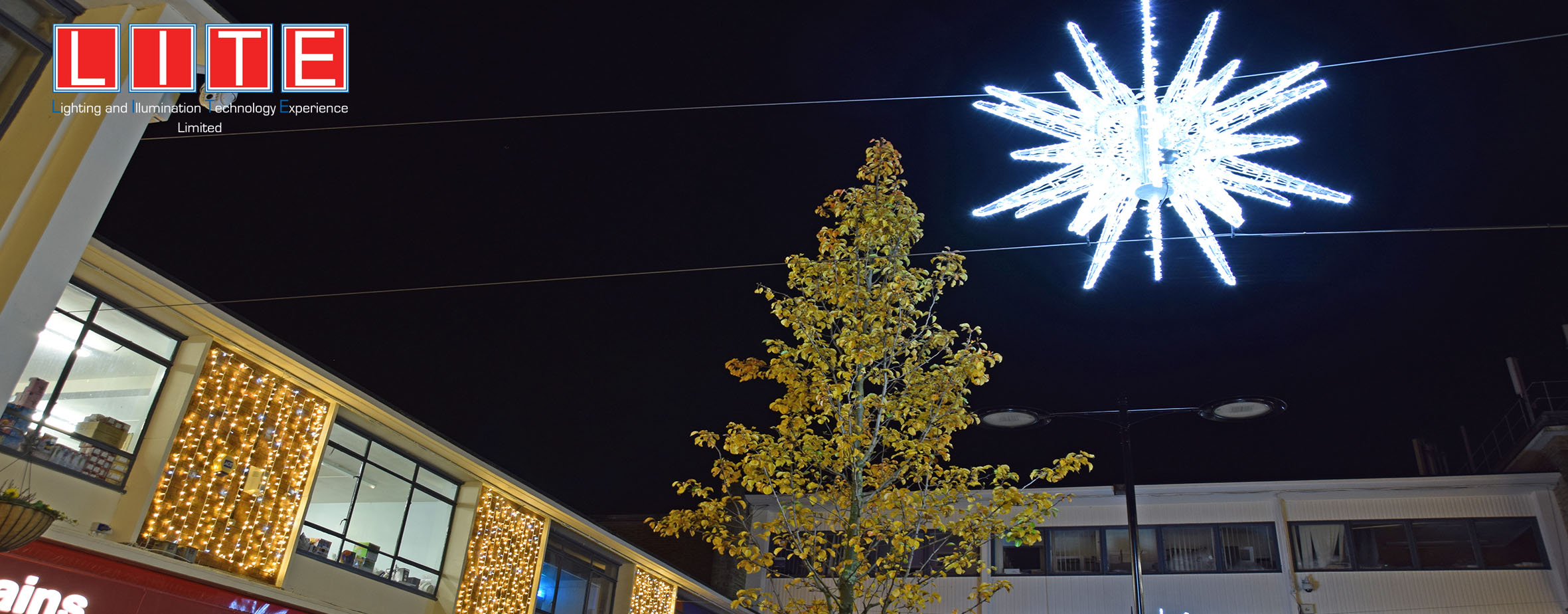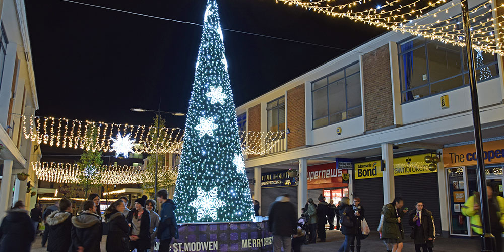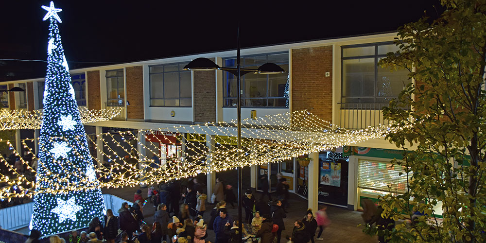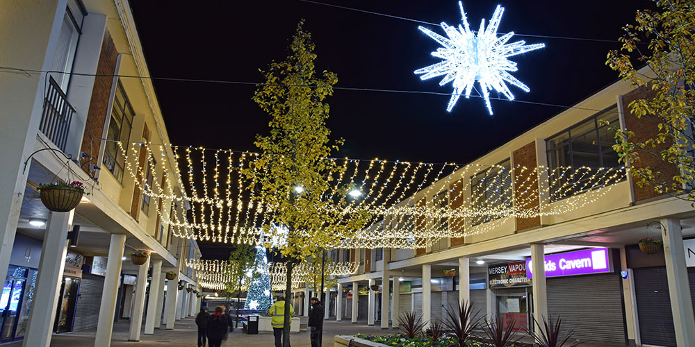 Using a variety of products, we were tasked with bringing Kirkby to life by the St Modwens Group Working very closely with the centre manager we chose an elegant gold and silver design, using our heavy duty rubber cabled MiniLEDs in gold and silver twinkle effect to create large curtains of light cascading down the walls of the buildings, and also to create large ceilings of light along the pedestrian walkways
