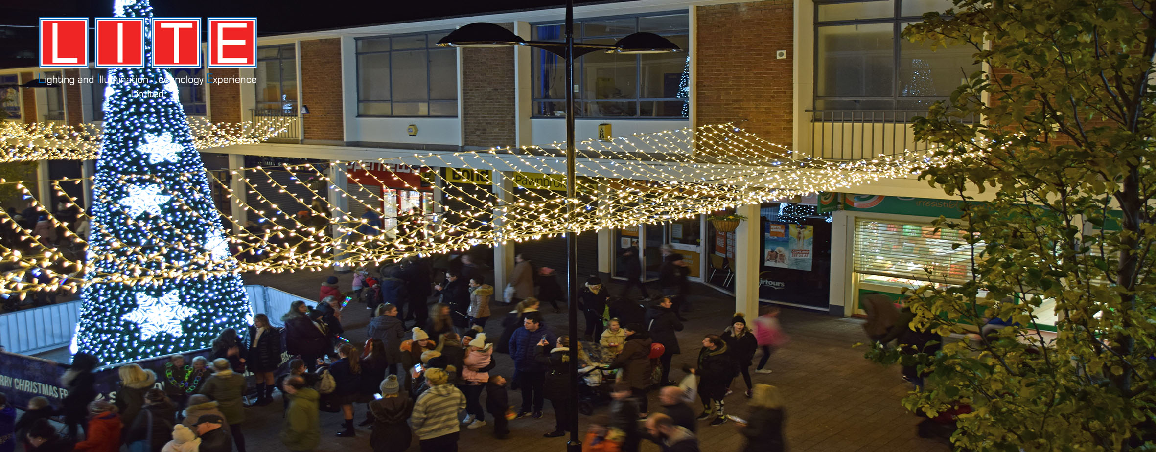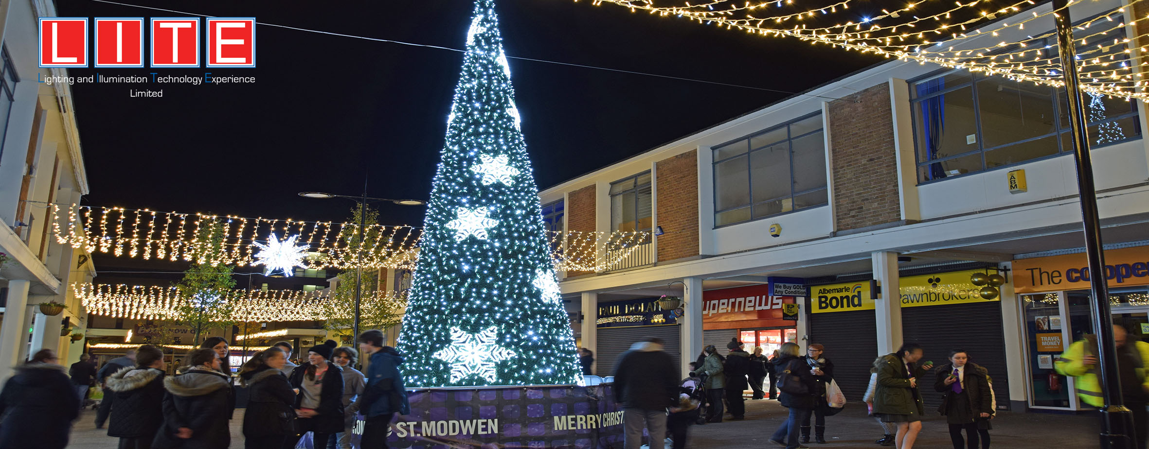 The whole scheme was centred around an 8M cone tree made up of aluminium framework, green carpet infill, and white rope light & MiniLEDs. The tree was featured in the Liverpool Echo newspaper, and was voted as one of the best trees in the Liverpool area in its category.